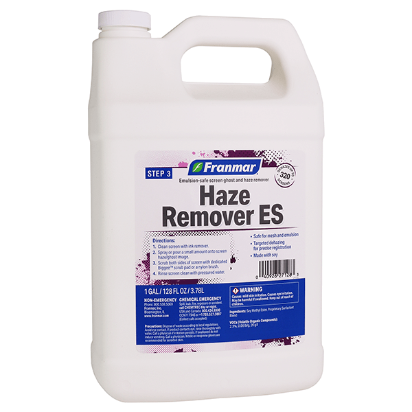Once again at the forefront of screen cleaning innovation, Franmar is pleased to introduce a cleaning product that will revolutionize the way you deal with haze and ghost images. Franmar’s Haze Remover ES is the first haze remover that is safe to use on emulsion without breaking it down or locking it in. Screens can now be thoroughly cleaned and haze removed without damaging the stencil prior to cataloging the screen for future printing. Haze Remover ES will keep screens looking like new even after multiple runs of prints.